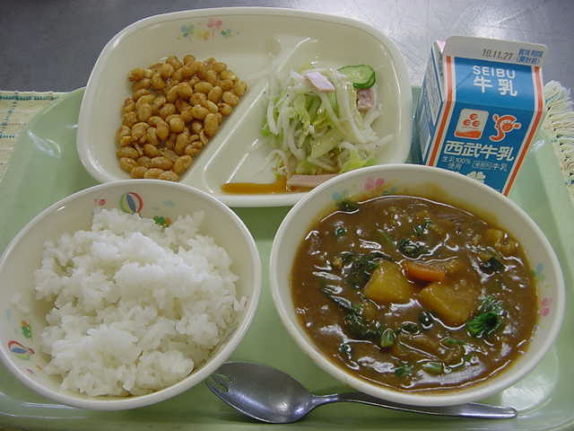 牛乳 小江戸カレー 大豆のカリカリ揚げ ハムと大根のサラダ