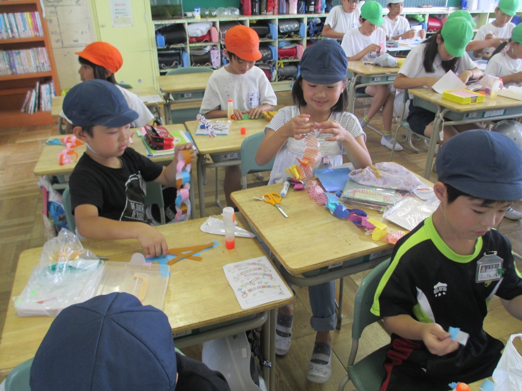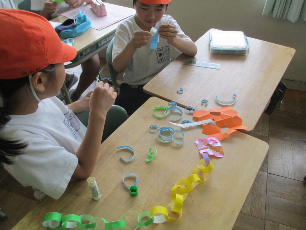 なかよしタイムでは1年生から6年生までの全ての児童が協力して、七夕のかざり作りをしました。7月7日(金)3校時の七夕集会が今から楽しみです。