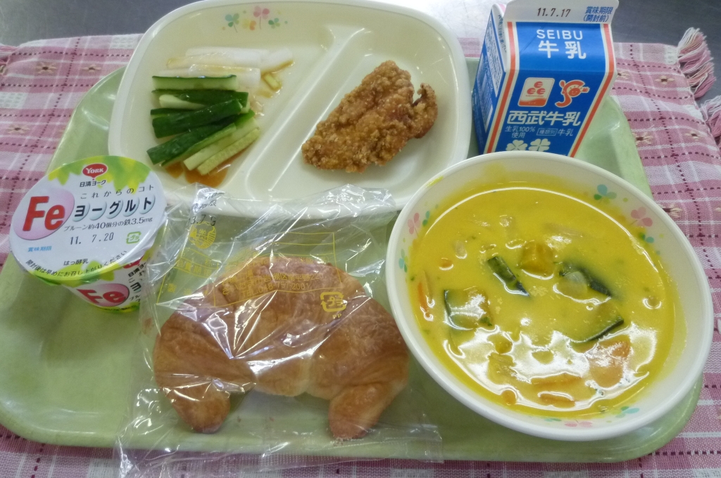 牛乳 クロワッサン カレー風味から揚げ スティック野菜