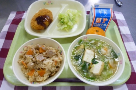 牛乳 かしわ飯 コロッケ 茹でキャベツ 野菜椀 みかん