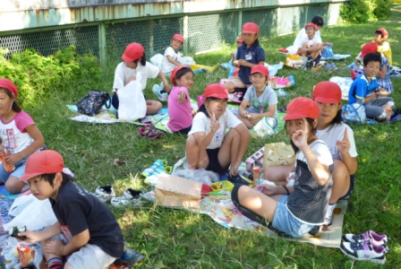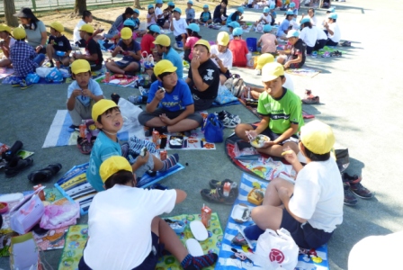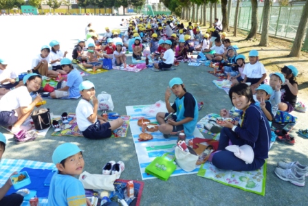 校庭で、仲よく(縦割りクループ)楽しくいただく野外給食でした!