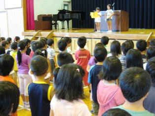 4名の新しい友達を迎え、571名で2学期の始業式を行いました。校長講話の後、1年生、4年生の代表児童が、2学期の抱負を述べました。学校行事の多い2学期、皆で力を合わせてやり遂げたり、自分のめあてに向かって力いっぱい取り組んでほしいと願っています。