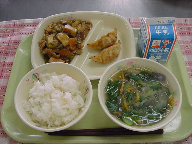 牛乳 ご飯 揚げぎょうざ 家常豆腐 春雨スープ
