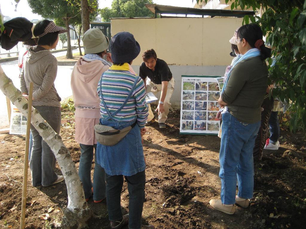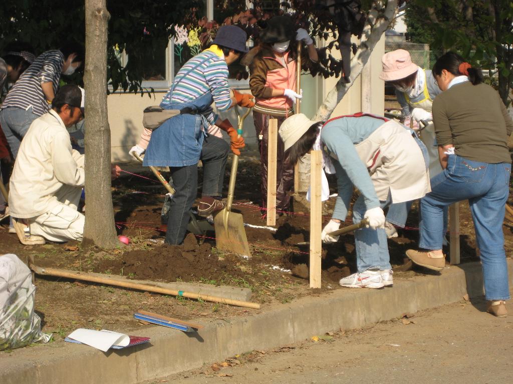 学校応援団の一つに花植えグループがあります。深谷市ガーデンシティ推進室「緑の王国」の協力を得て、ランチルーム周辺の花壇などを新たにミニ公園として整備することになりました。花植えグループの方々が煉瓦敷きから始めました。参加者を随時受け付けていますので、お声がけください