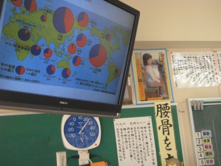 各クラスの教室には、統一してあるものがあります。写真は5年生の教室です。①モニターテレビで資料を写します。②「発表の仕方」を示して話し方を指導します。③今日の予定を示して、子ども達が見通しをもって生活できるようにしています。④「腰骨を立てる」方法を写真で説明しています。これらのことが学力向上の一助になると考えています。