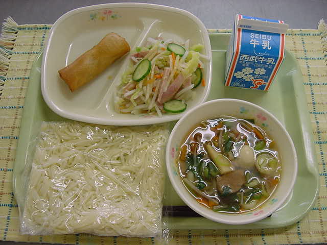 牛乳 広東麺 春巻き ハムと大根のサラダ