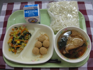 きつねうどん 牛乳 白玉団子のきなこあえ
