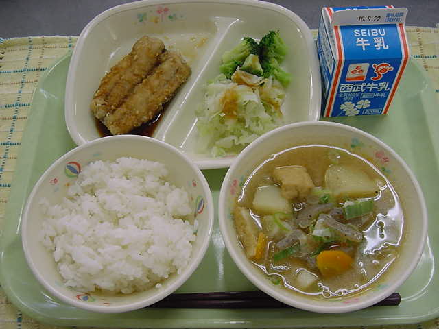 牛乳 ご飯 さんまの蒲焼 野菜椀 温野菜ドレッシングあえ
