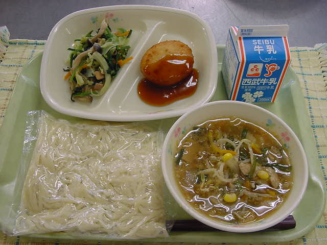 牛乳 ゴマ味噌ラーメン いももち 青菜ときのこのソテー