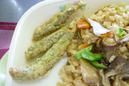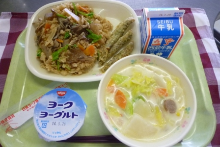 牛乳 舞茸ご飯 小イワシフライ 春キャベツの豆乳スープ