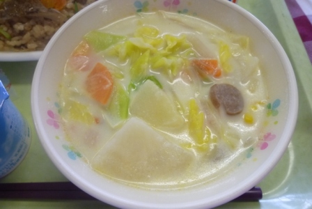 豆乳スープに、旬の春キャベツをたっぷり加えました。(カルシウムアップ!!)