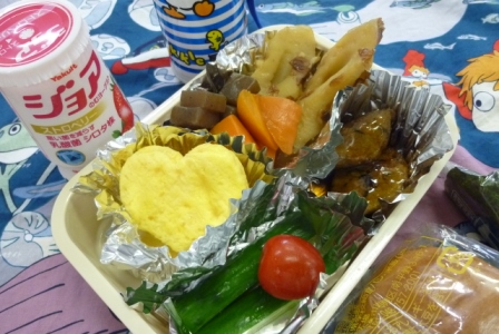 ハートのオムレツ つみれの甘辛煮 竹輪とコンニャクの煮物