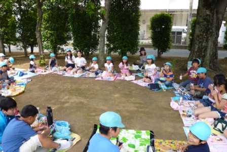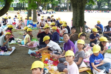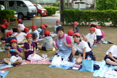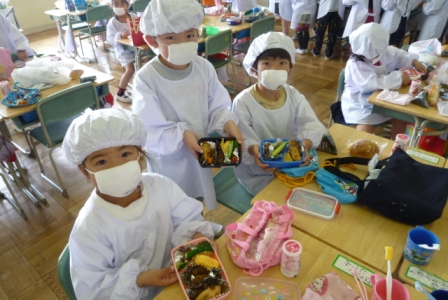 でかけ、縦割り班(なかよしグループ)でいただきます。