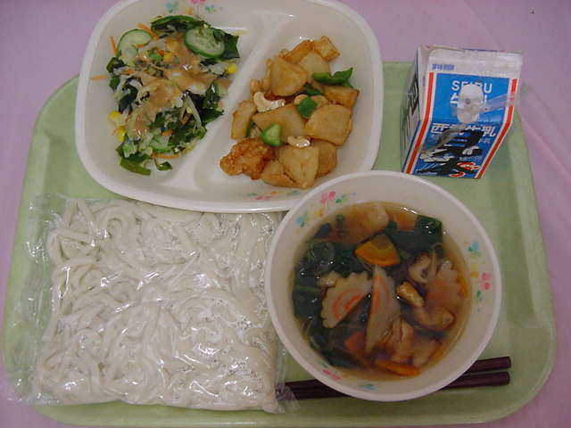 牛乳 五目うどん 鶏肉のカシューナッツ炒め