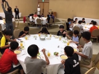 ホテルに到着し、テーブルマナーに気をつけながら夕食を食べています。