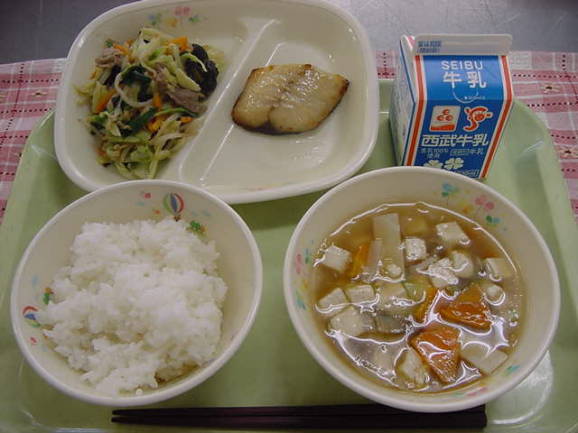 牛乳 ご飯 サバの西京焼き 野菜炒め 吉野汁