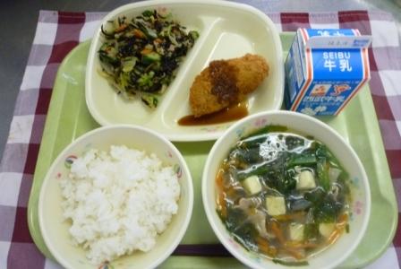 牛乳 ご飯 アジフィーレフライ ツナとヒジキのサラダ