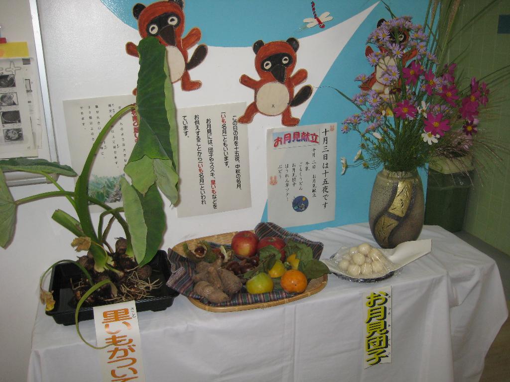 明日は十五夜です。給食室前に十五夜飾りが並びました。さといも、くり、さつまいも、おだんご、・・・秋の味覚がそろっています。初めて見る子ども達もいますが、季節を感じ、自然の恵みを大切にする心を育てたいです。