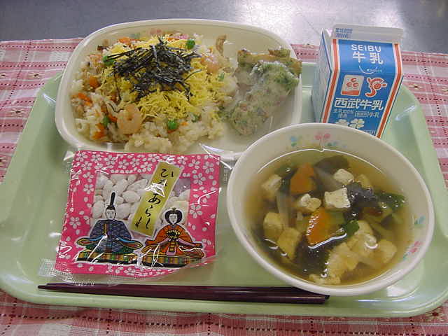 牛乳 ちらし寿司 ちくわの磯辺揚げ 澄まし汁 ひなあられ