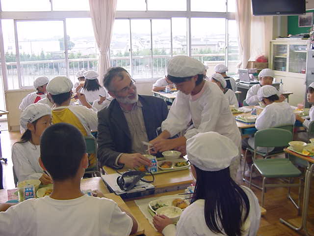給食は5年1組の教室で、子供たちと楽しく会食