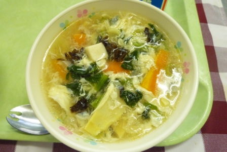 人参・タケノコ・きくらげ・豆腐が入った中華スープに、