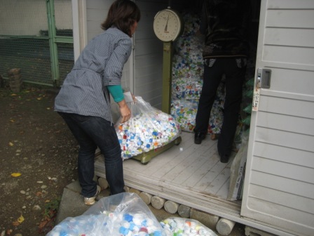 エコキャップ回収ボランティアの方々に、集まったペットボトルのキャップを計量していただきました。1キログラムのキャップを400個として計算し、800個でポリオワクチン1人分を協力できます。