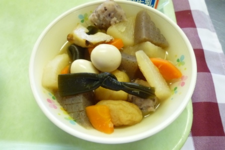 薄味のおでん汁をつくり、昆布、根菜類、練り製品の順で加え