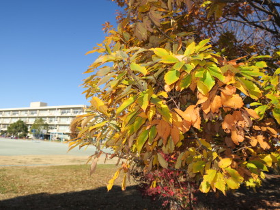 校庭の樹々の葉も木枯らしに舞い落ちて、枝が寒空に震えるなか、幾つかの木の葉が最後の輝きを見せています。色付いた葉と校舎、校庭で遊ぶ子供達の元気な声から、また一つ元気をもらいました。