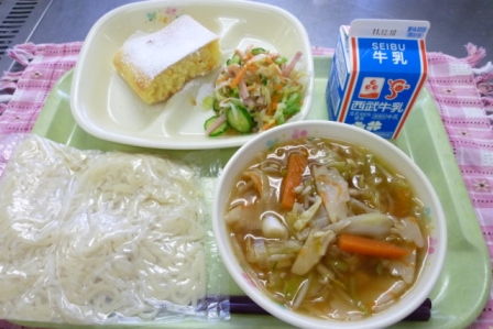 牛乳 三馬麺 オレンジパンケーキ キャベツとハムのサラダ