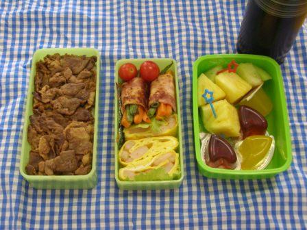 事前の調理実習で、ベーコン巻きやたまご焼きの作り方を学習し、栄養バランスや彩りも自分で考えました。