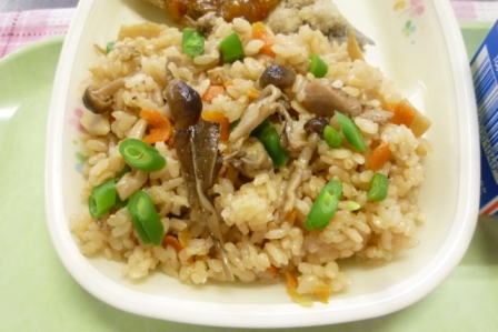 今日は、舞茸としめじがたっぷり入った、きのこご飯です。
