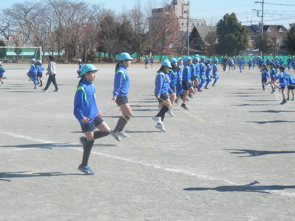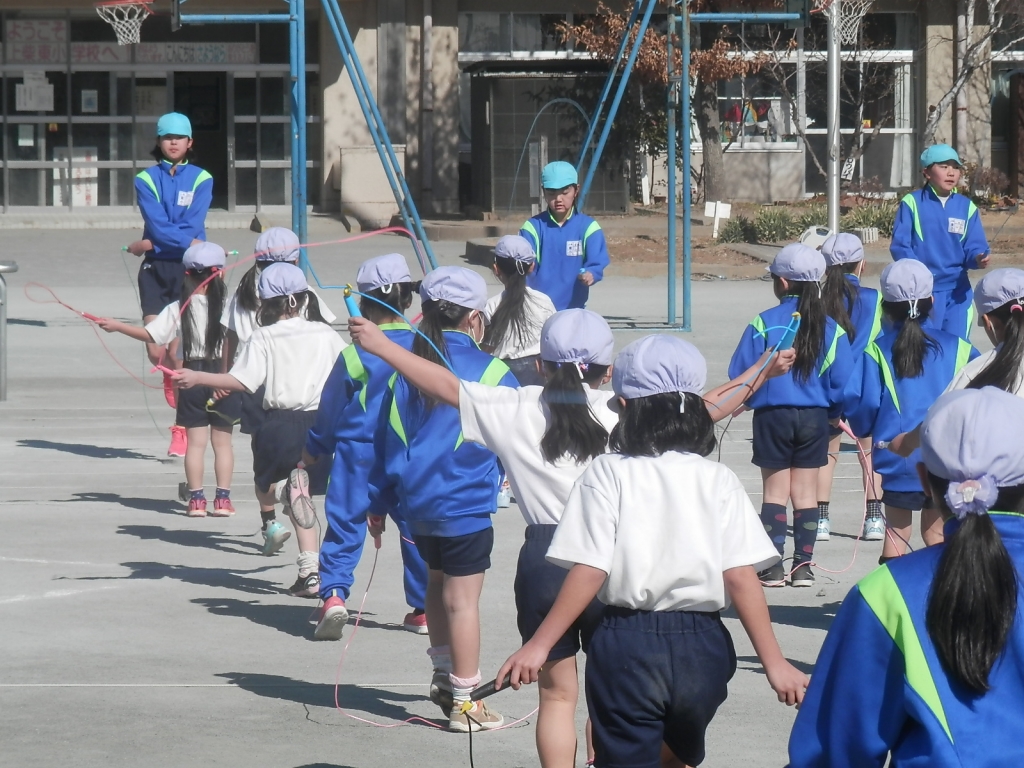 2時休みのさわやか運動では、東小リズム縄跳びをしています。銀河鉄道999の曲に合わせて、前とび、交互二回とび、かけ足とび、前ふり出しとび、前ふりももあげとび、横ふりとび、左右開閉とび、前後開閉とび、あやとび、あやとび(かけ足)、前後移動とび、左右移動とび、十字移動とび、自分の大技、かけ足とび、交互二回とび、前とびなどをしています。子供達は、元気にとんでいます。
