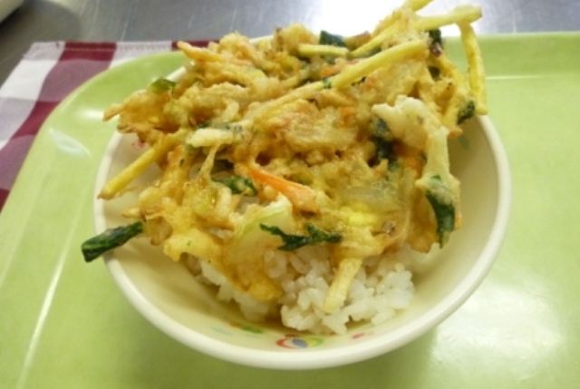 かき揚げです。天つゆをかけていただきます。