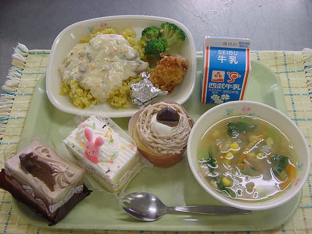 牛乳 カレーピラフのドリア風 フライドチキン 茹でブロッコリー
