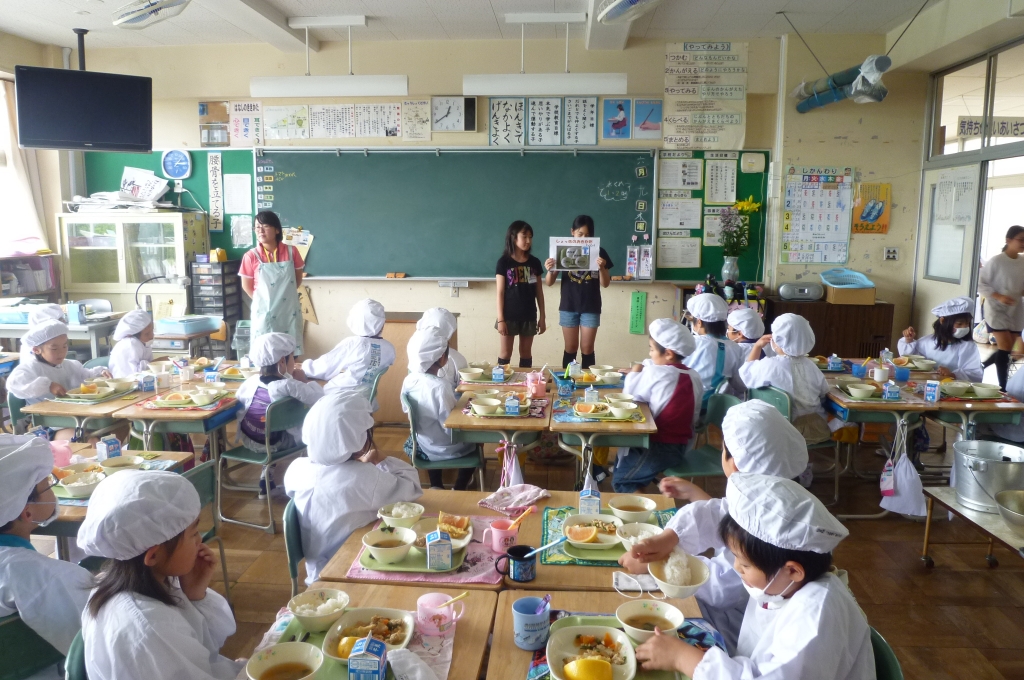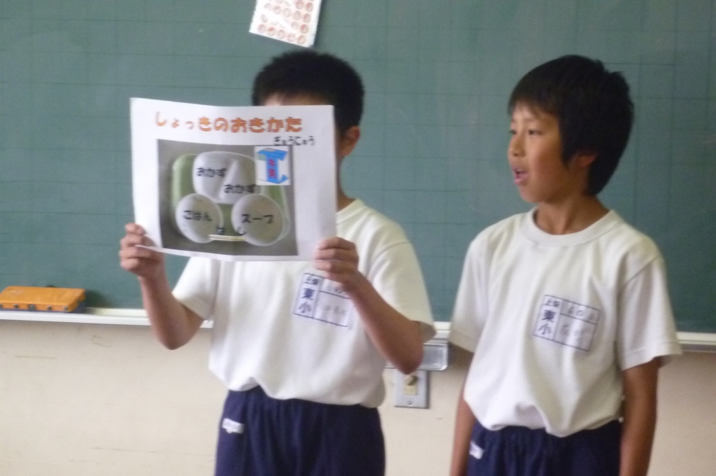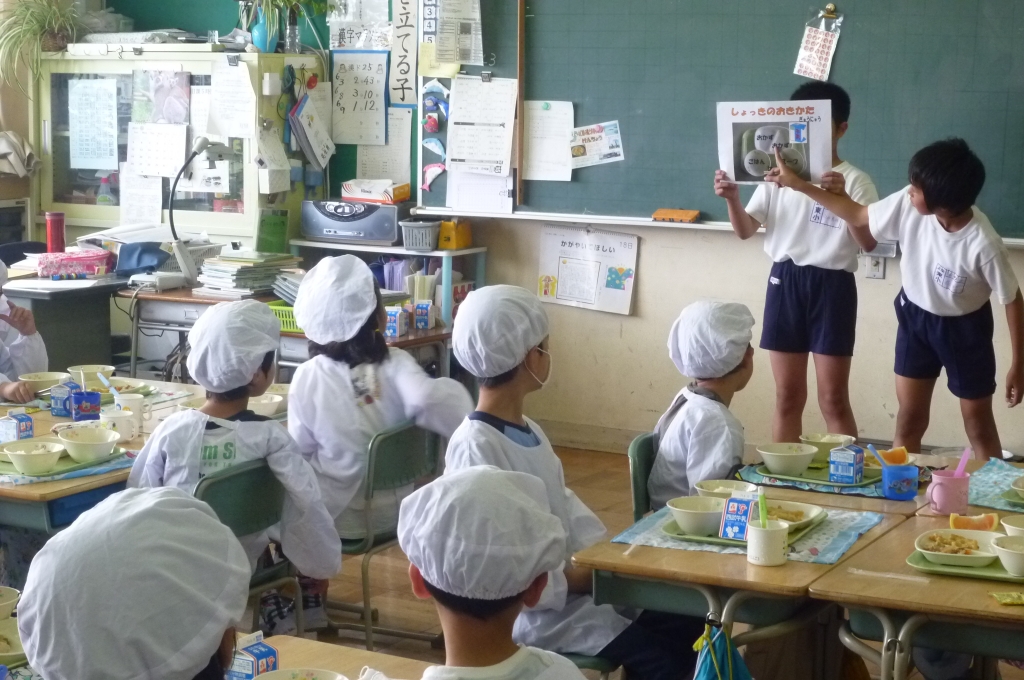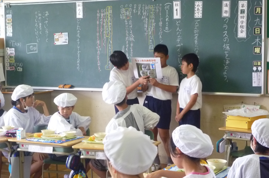 みなさんできていますか?食器は手で持って食べましょう。」などと、給食委員が