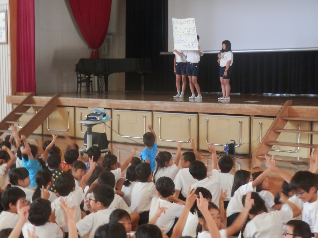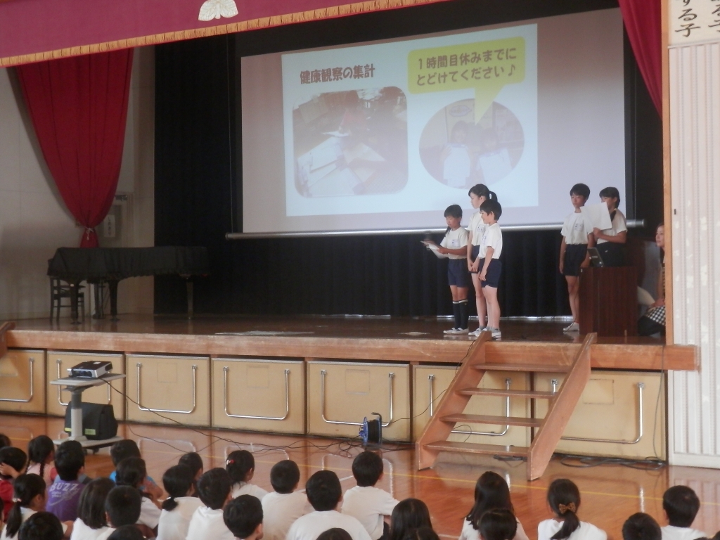 20日(火)の児童集会は、保健委員会の発表でした。活動の紹介と熱中症予防についてや簡単な応急措置の仕方などを発表してくれました。ゲームでの紹介なので子供達は、楽しみながら覚えることができました。安全な生活をしてほしいと思いました。