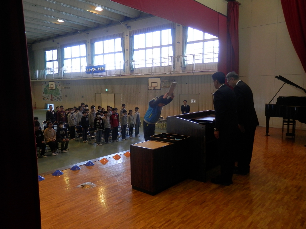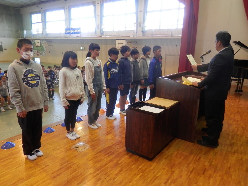 一足早く6年生の修了式を行いました。式に先立ち6カ年皆勤表彰、体育優良表彰、産業教育表彰、優良児童表彰も行いました。また、修了式では、自分を大切にすること。友を大切にすること。を話しました。明日は、卒業式です。よい式になりますようにと願っています。