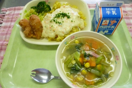 牛乳 カレーピラフのドリア風 鶏のからあげ 温野菜