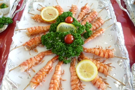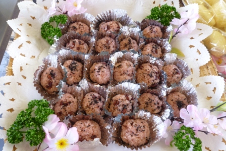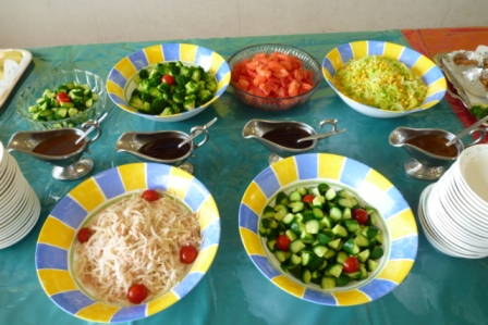 お赤飯のおむすび              エビの串焼き               サラダバー