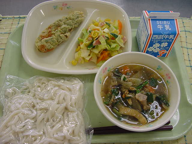 牛乳 根菜ごまうどん 笹カマボコの磯辺揚げ