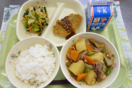 牛乳 ご飯 アジフィーレフライ からしあえ 肉ジャガ