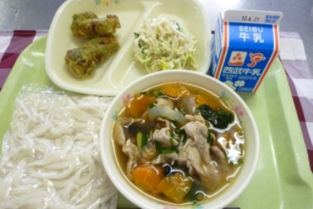 給食の肉うどんは、香味野菜をたっぷり使用します。