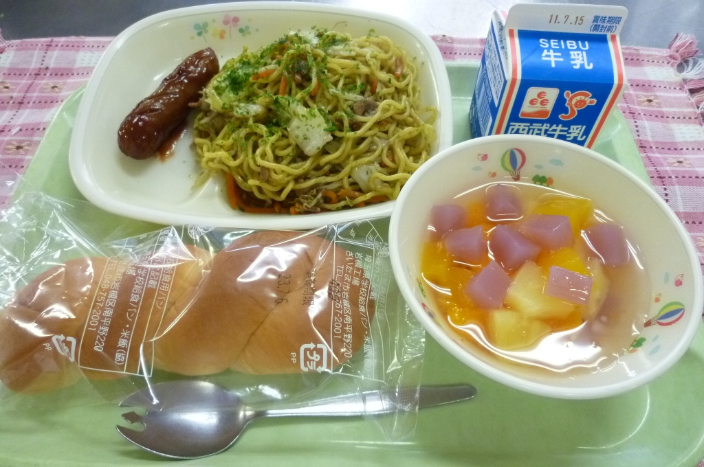 牛乳 ツイストパン ソース焼きそば フランクフルトのケチャップあえ