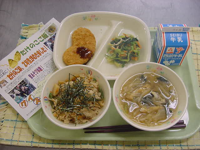 牛乳 竹の子ご飯 白花豆のコロッケ からしあえ
