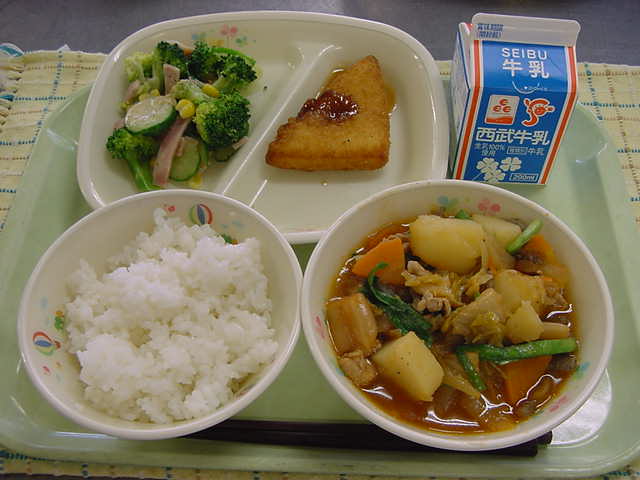 牛乳 ご飯 チーズハンペンフライ ブロッコリーサラダ