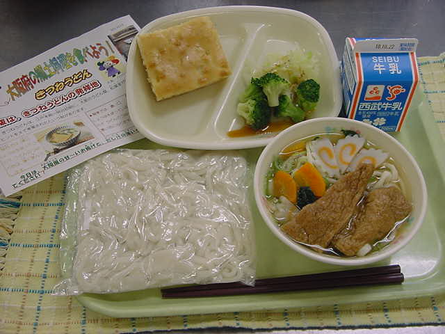 牛乳 関西風きつねうどん リンゴパンケーキ 温野菜