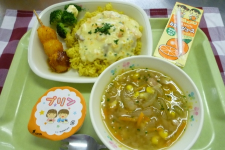 オレンジジュース カレーピラフのドリア風 うずらの玉子フライ 温野菜