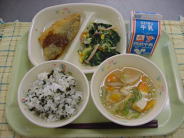 牛乳 わかめご飯 アジフィーレフアイ 青菜ときのこのソテー