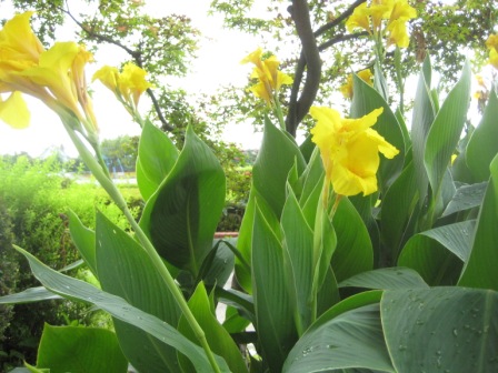 猛暑が続いた後の一雨で、カンナの花も元気を増したように咲いています。