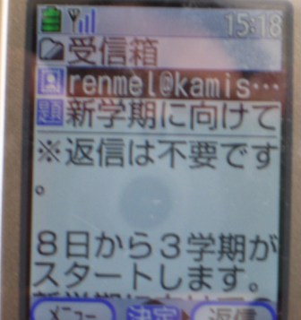 携帯電話への連絡メール配信を行っています。学校行事、緊急連絡や事前連絡、不審者情報等を必要に応じて配信します。今後ともご理解、ご協力をお願いいたします。なお、アドレスや登録方法についての問い合わせは学校へご連絡ください。